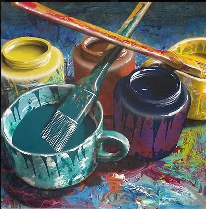 So, in one of those moments in the studio, the answer presented itself. Right in front of me was the very thing I was looking for....the mess I make every day while I paint. The drips, and splatters, the brushes and jars, the cups....there was paint everywhere, smeared all over everything....the perfect subject!